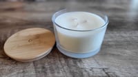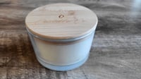 Reusable double wall glass jar with Bachman Candle Co. inscribed wooden lid.